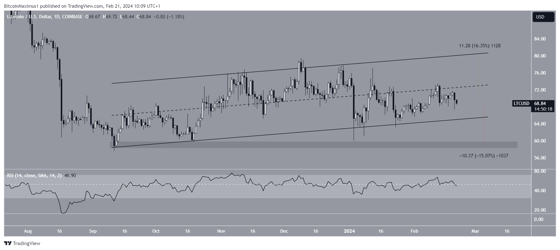 NebraskanGooner suggests the LTC price can appreciate if it breaks above $72. CryptoMoneyKing gives a similar thought.