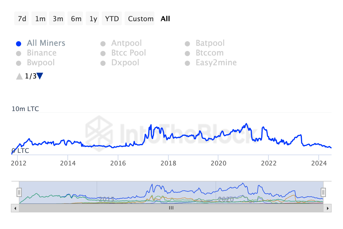 When it declines, it suggests that miners on the Litecoin network are distributing their coins for profit or to sort mining costs. At 1.61 million LTC at press time, the market value of coins held by Litecoin miners is $120 million.