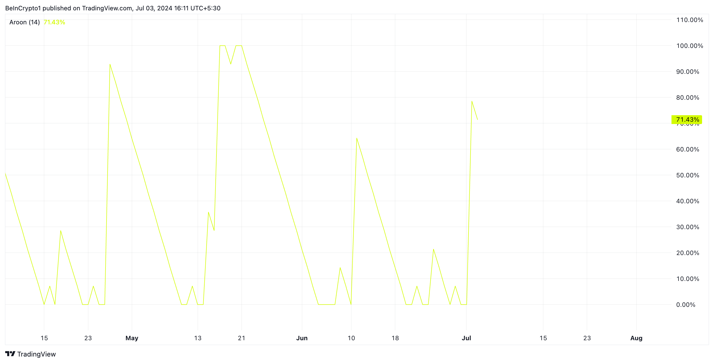 LTC’s rising Aroon Up Line confirms the strength of the current uptrend. At press time, the indicator’s value is 71.43%.