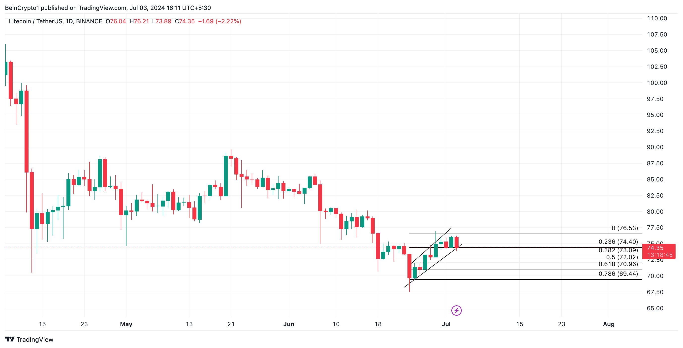If selling pressure gains momentum, LTC’s price may fall to $73.09.