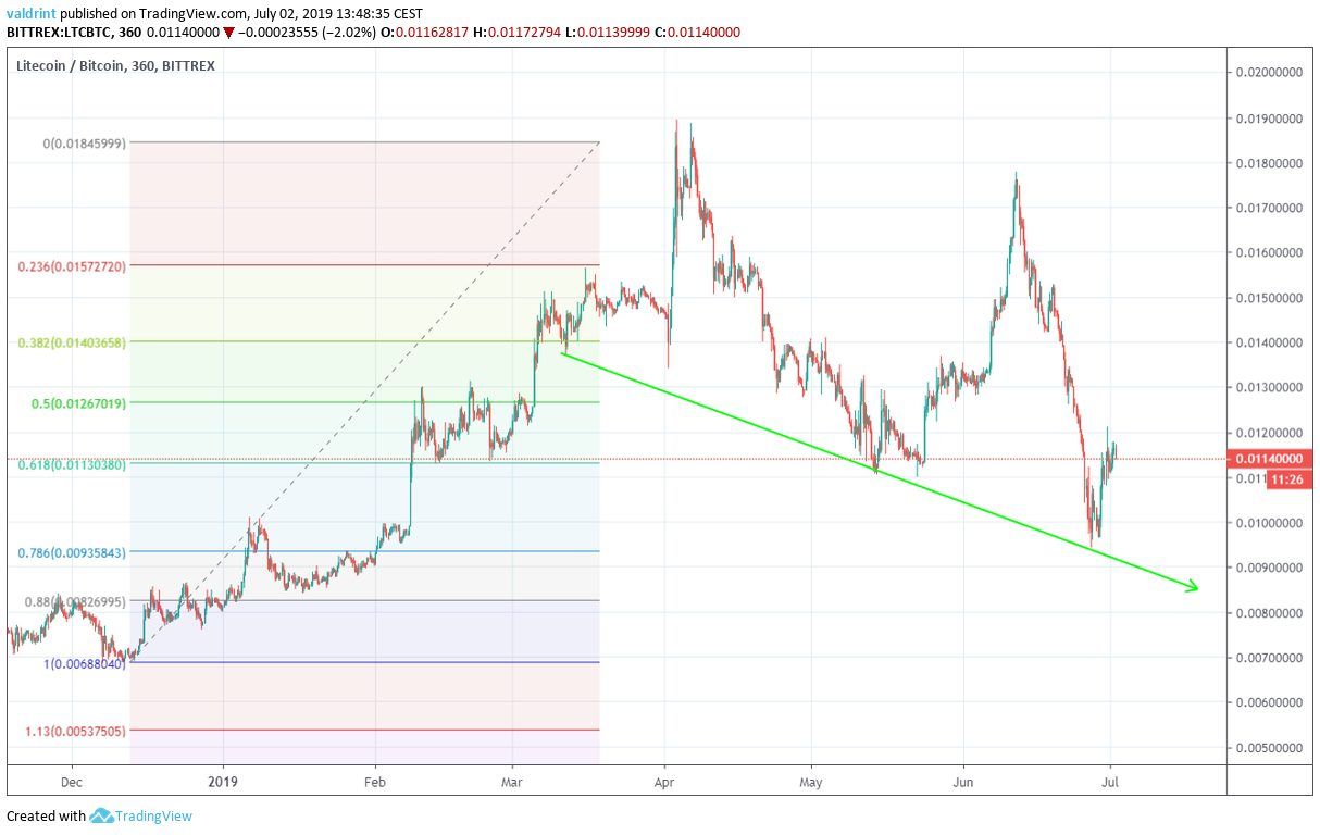 On Apr 3, 2019, the Litecoin price reached a high of ₿0.0186. A gradual decrease followed shortly after. After reaching levels close to ₿0.018 on June 12, a rapid decrease ensued.