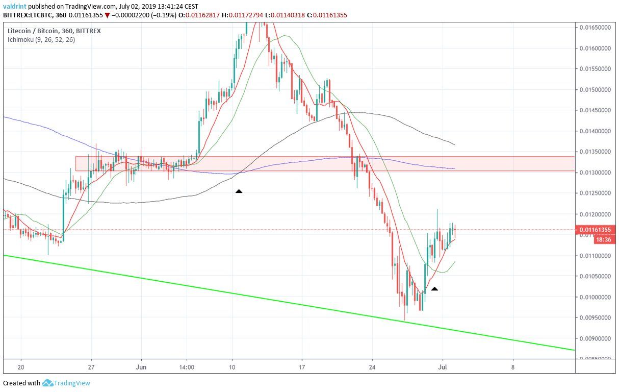 In the end of June, the LTC price made two lows below ₿0.01 before beginning an upward move.