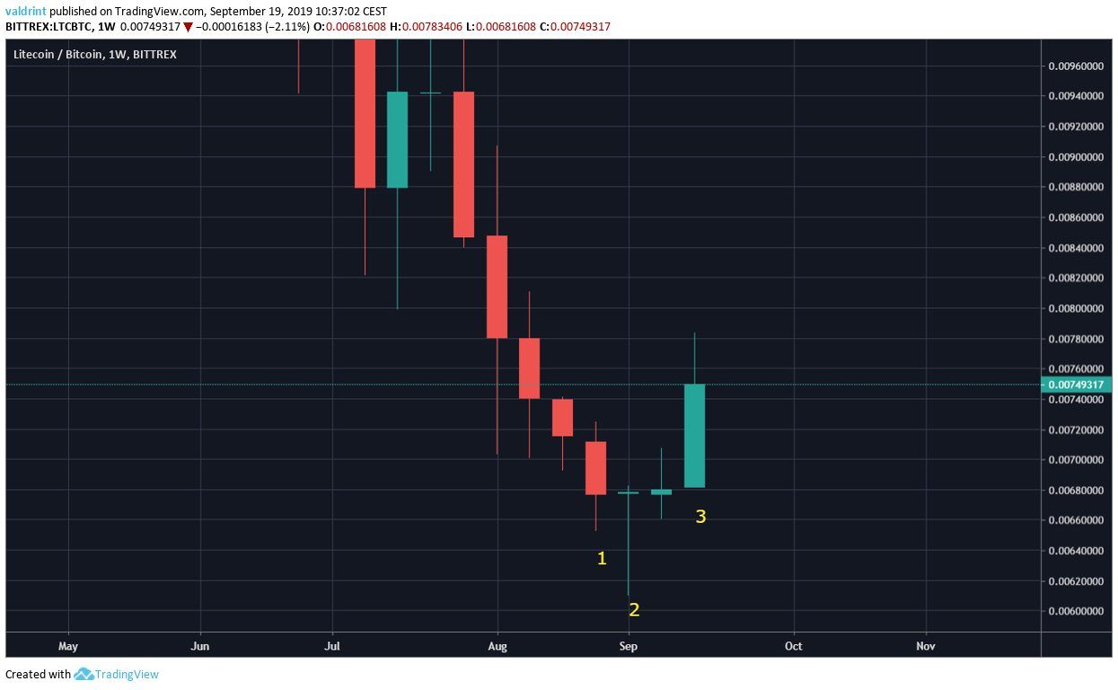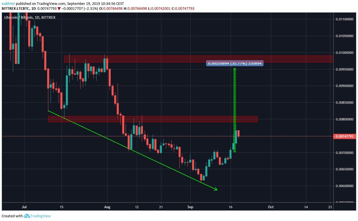 On September 5, 2019, the Litecoin price reached a low of ₿0.0061. Since then, it has initiated two upward moves, lasting five days each — increasing by 16 percent and 18 percent, respectively. On September 18, Litecoin reached a high of ₿0.0078.