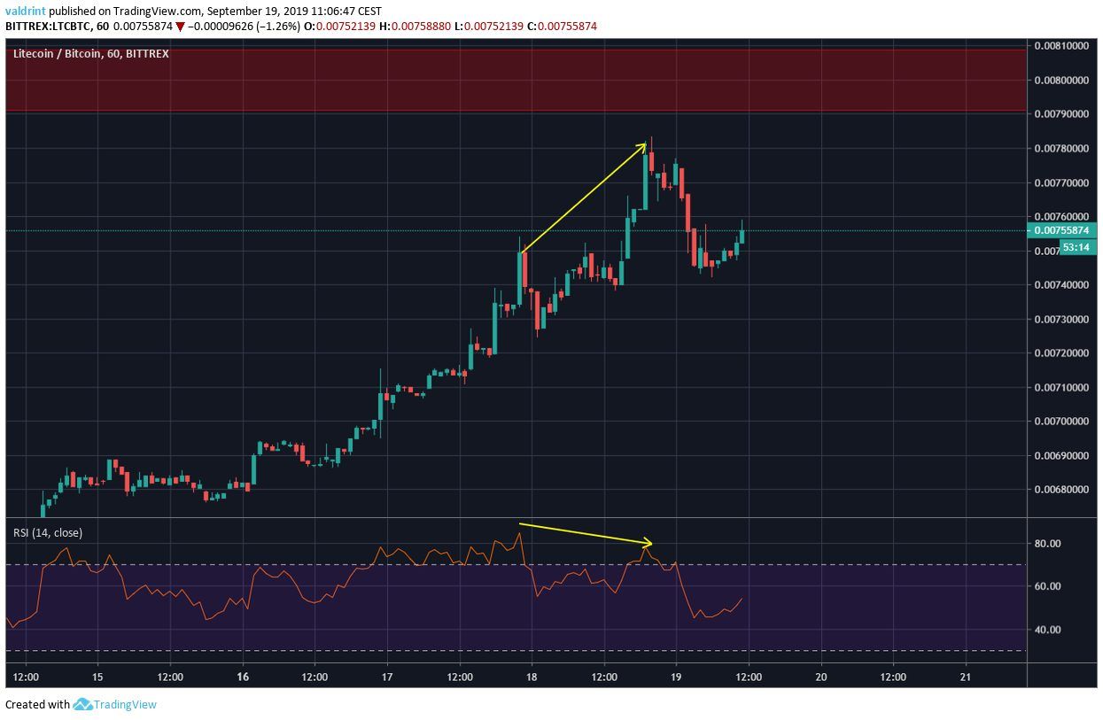 Going back to the hourly time-frame, we can see that LTC has begun to show signs of weakness, in the form of bearish divergence.