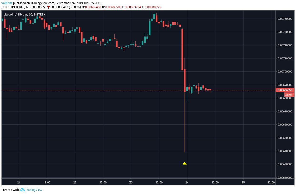 On September 18, the Litecoin price reached a high of ₿0.0078. A slow decrease ensued until September 23. Then, a flash crash occurred and LTC lost 12.7 percent of its value in a span of two hours — reaching a low of ₿0.0064.