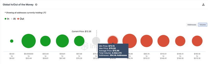 Sponsored SponsoredIt, however, shows that LTC must first scale the initial resistance at $76 for the bulls to be confident of reclaiming $80. As depicted below, 364,400 holders had bought 4.53 million LTC at the average price of $75.99. If those holders close their positions early, they could slow down the Litecoin price rally.