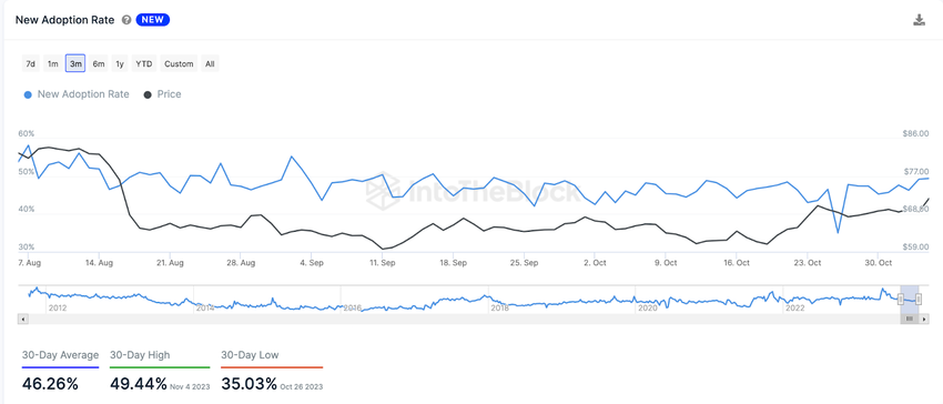 According to IntoTheBlock, the New Adoption Rate on the Litecoin network reached a 1-month peak of 49.44% on November 4. This brings it well above the 30-day average of 44.26%.