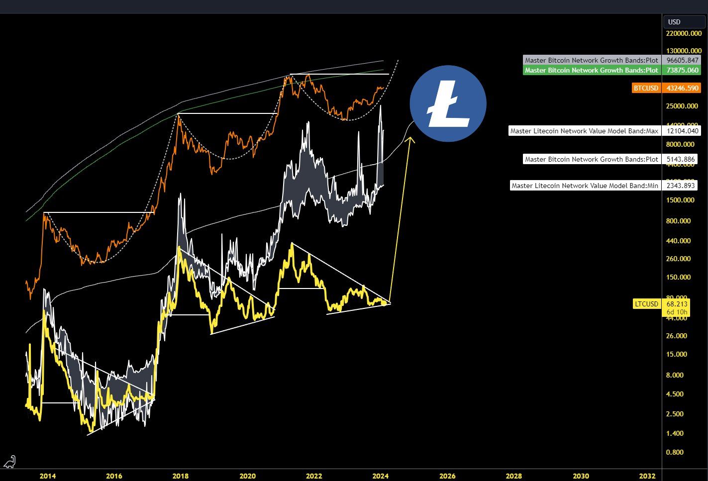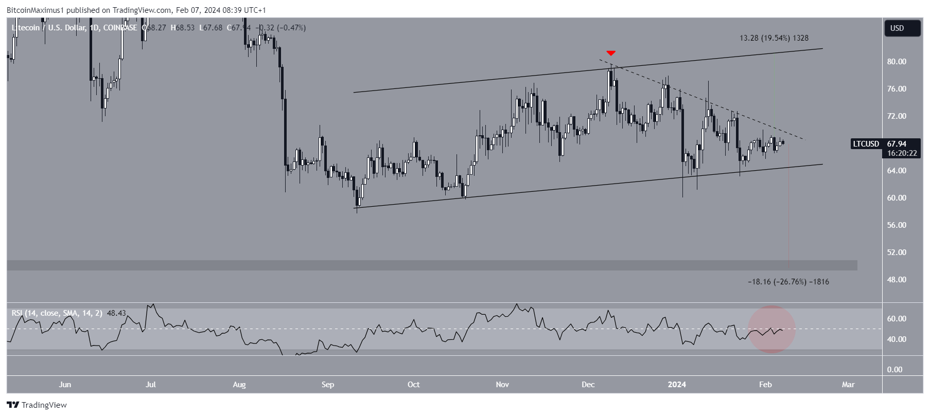 The chart shows LTC has traded in an ascending parallel channel since September 2023. These channels usually contain corrective movements, meaning a breakdown is expected.