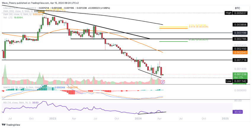 Despite the significant downward trend in LTC price against Bitcoin, there are indications of a potential reversal. Notably, the MACD lines exhibit a bullish crossover on the weekly chart, while the RSI indicates a bullish divergence.