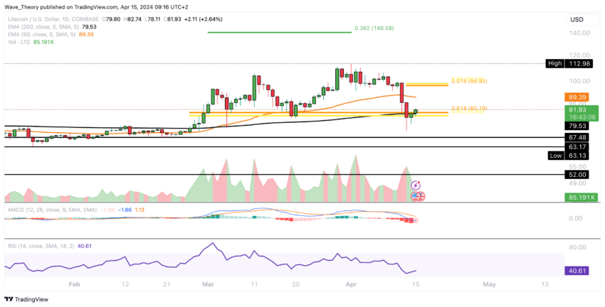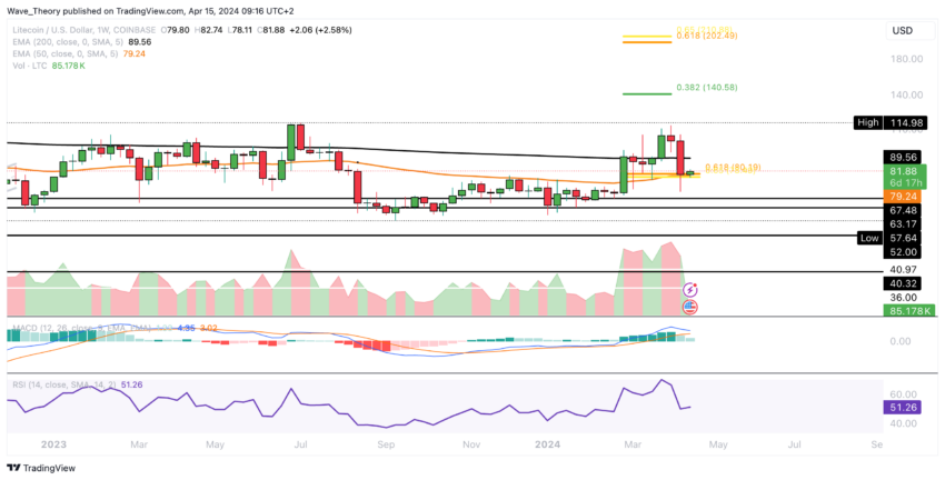 Last week, the LTC price initially dipped below the Golden Ratio support level of around $80. However, the price had precisely returned to this critical support level by the week’s close.