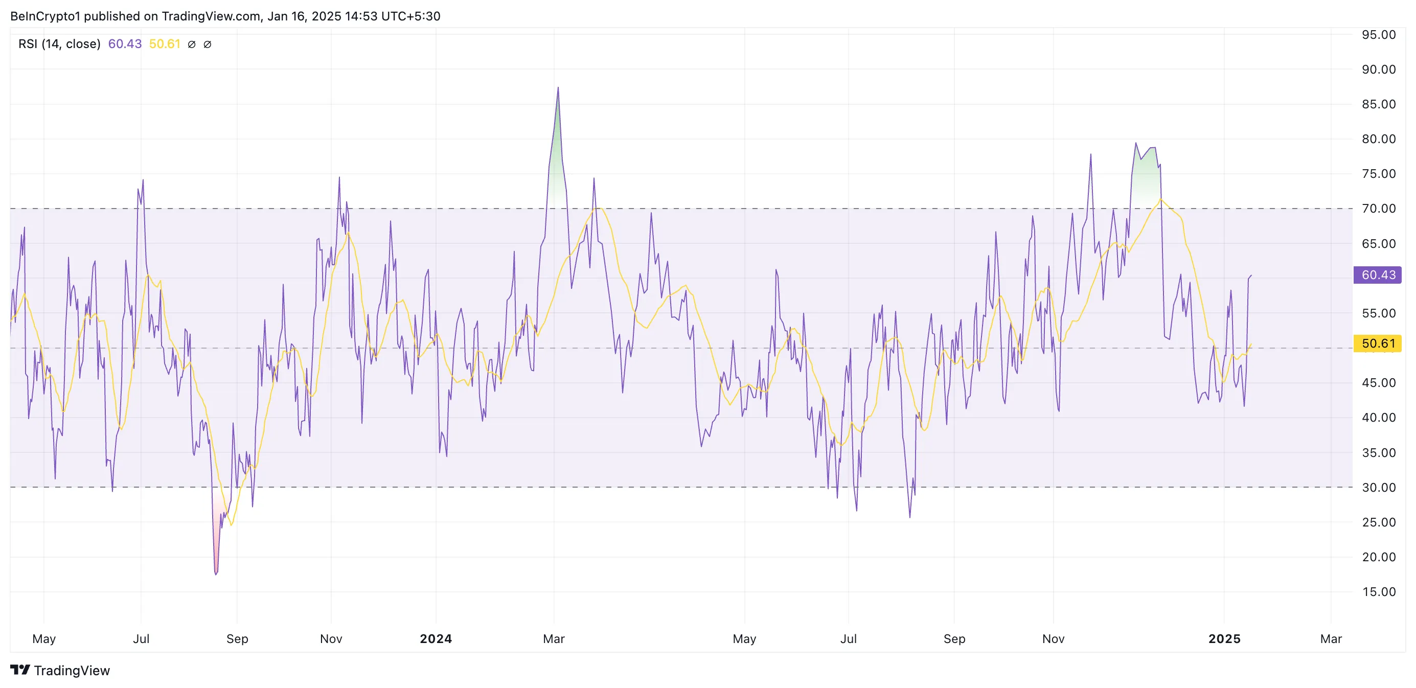 At 60.43, LTC’s RSI suggests it is experiencing bullish momentum, with more buying pressure than selling pressure. If this continues, its price could break above the resistance at $124.03 to revisit the three-year high of $147.
