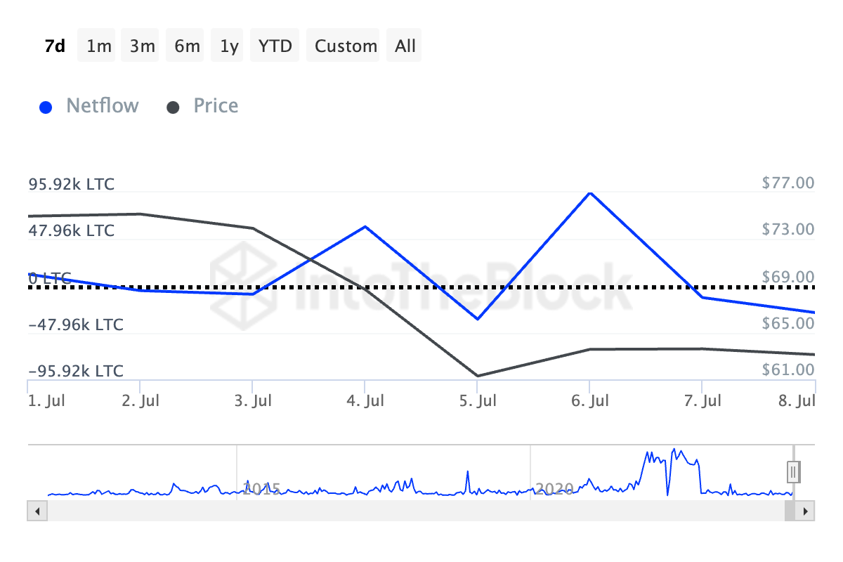 This is due to the steady fall in the coin’s value and large holders’ desire to prevent further losses. As of this writing, LTC trades at $65.73, falling by almost 15% in the past seven days.