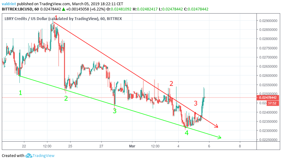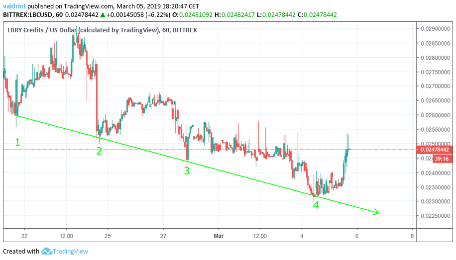 The price of LBC on Bittrex is analyzed on 1-Hour intervals from Feb 22 to Mar 5.