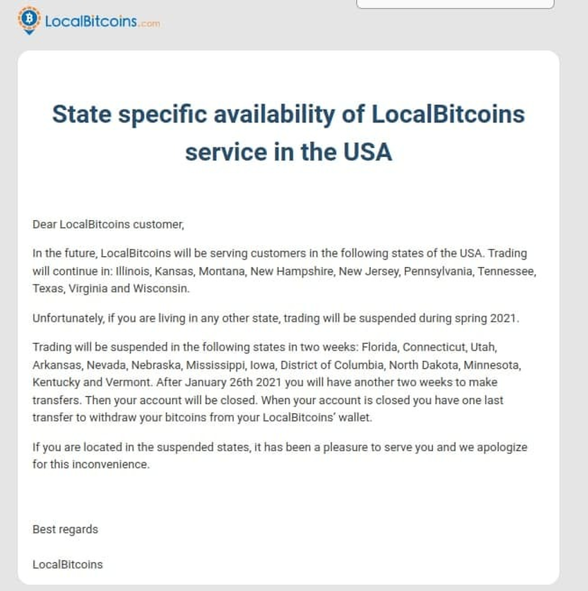 LocalBitcoins.com will cease operating in all remaining states, aside from the aforementioned ten, by Spring 2021. It added that operations will be suspended sometime within the next two weeks for Florida, Connecticut, Utah, Arkansas, Nevada, Nebraska, Mississippi, Iowa, District of Columbia, North Dakota, Minnesota, Kentucky, and Vermont.Â