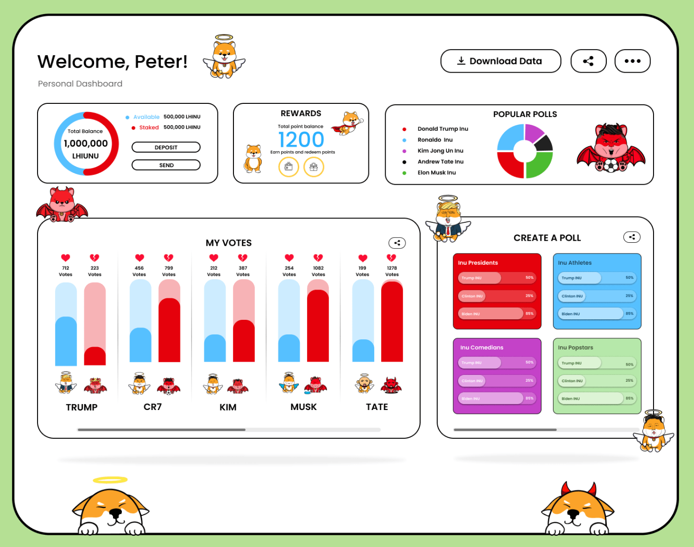 This meme coin pioneers a new Vote-to-Earn (V2E) concept powered by blockchain technology that allows users to earn LHINU tokens for participating in various polls.