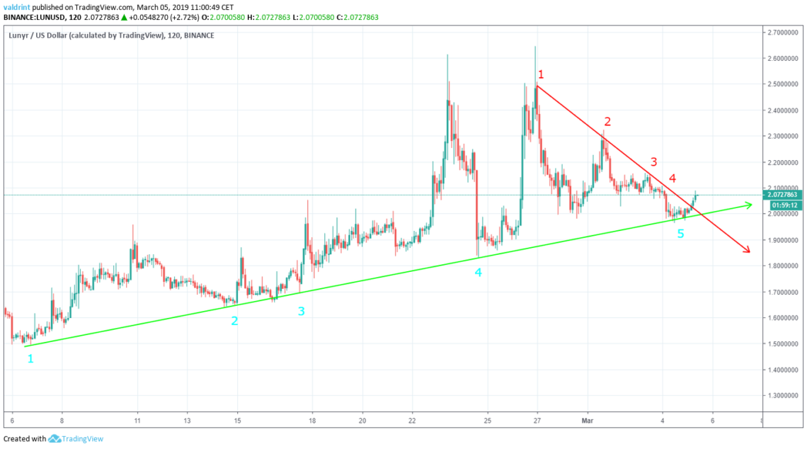 Lunyr experienced a low of $1.5 on Feb 6. A gradual rise ensued, in which price continuously made ascending lows.