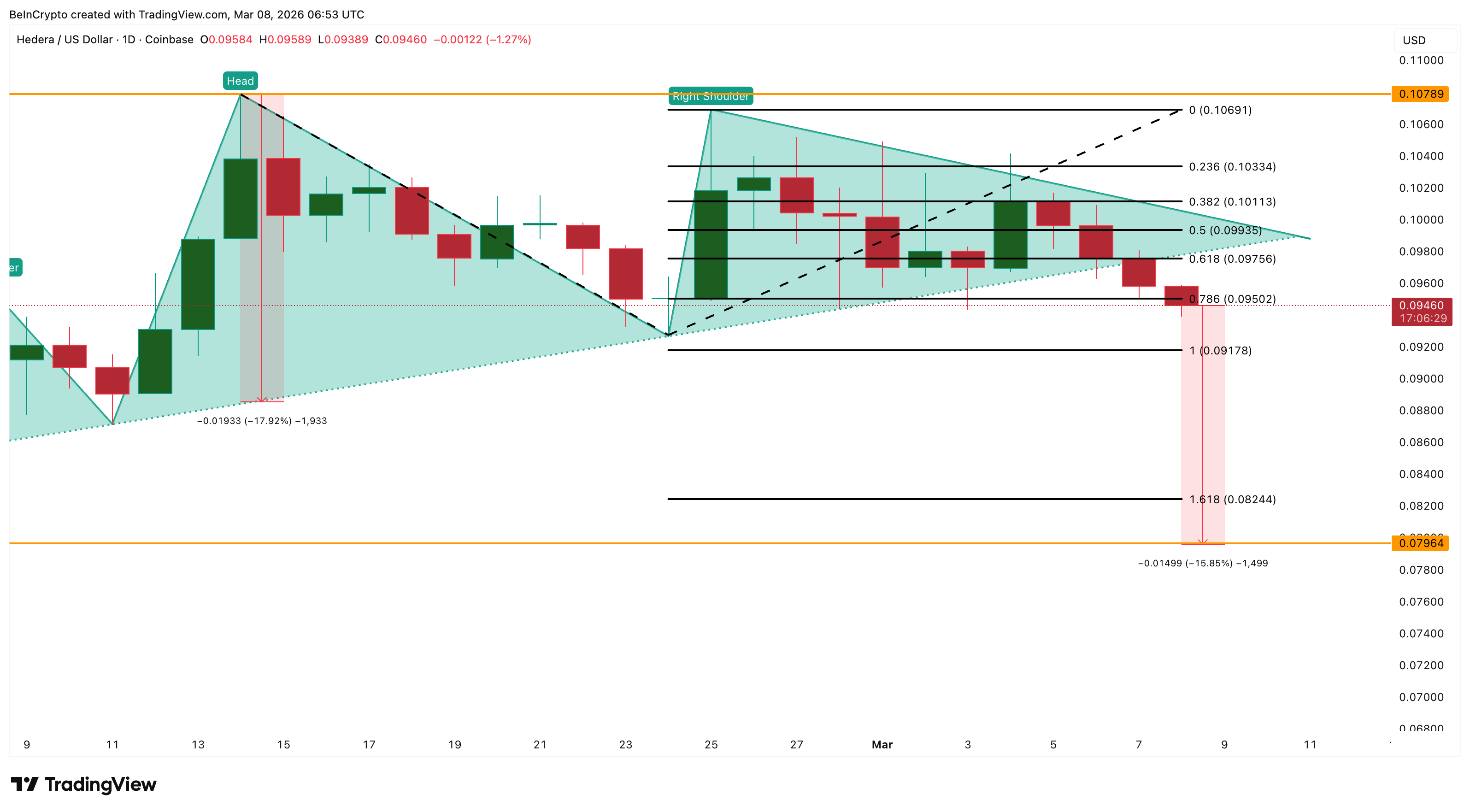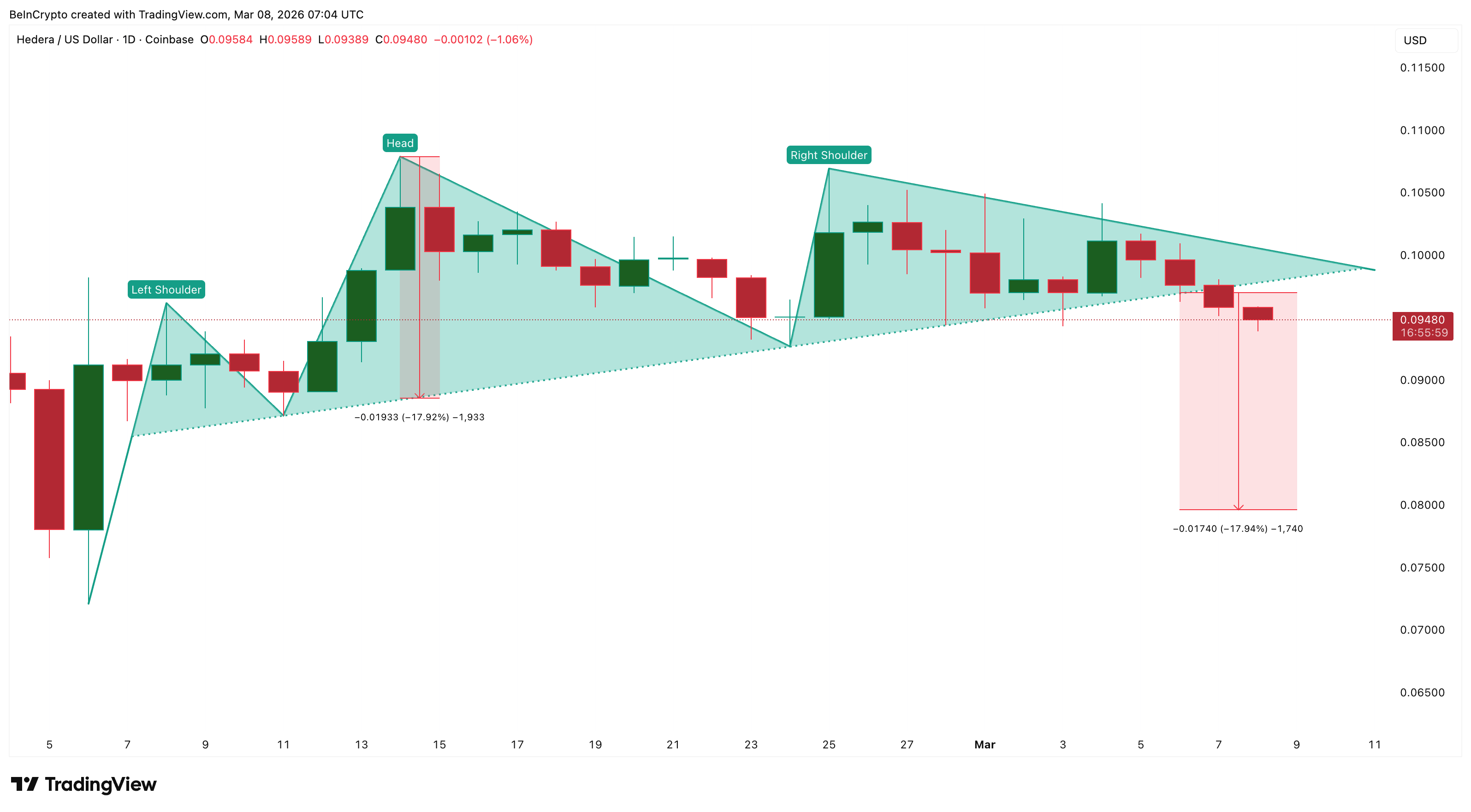 Following the neckline break, the head-and-shoulders pattern projects a potential move toward $0.079. From the neckline, this represents roughly an 18% downside move, while from current levels near $0.094, the remaining risk is about 15%.