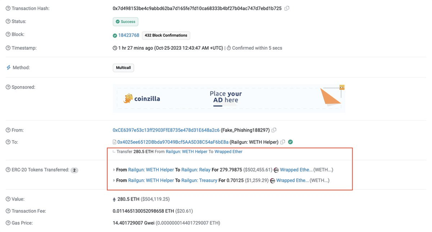 The Maestro attacker has transferred the 280 ETH to Railgun, which is a crypto privacy tool that hides transaction details.