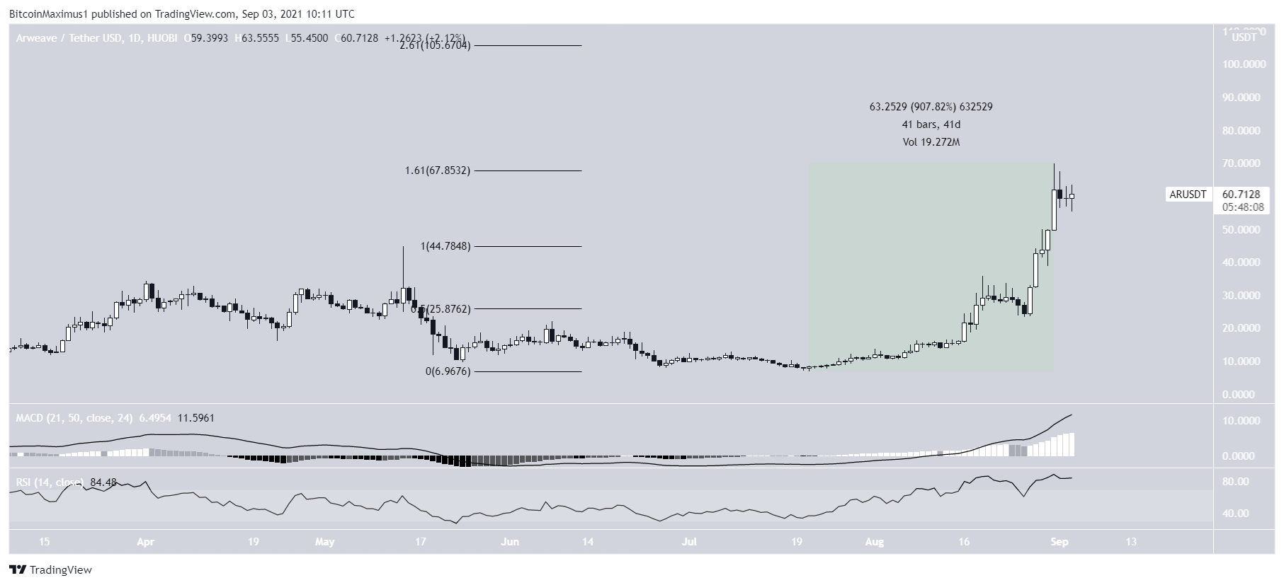 AR has been increasing at a rapid rate since July 21. In a span of 41 days, it moved upwards by 907%. This led to a new all-time high of $69.93 on Aug 31. Similar to FTM, the high was reached right at the 1.61 external Fib retracement resistance level.