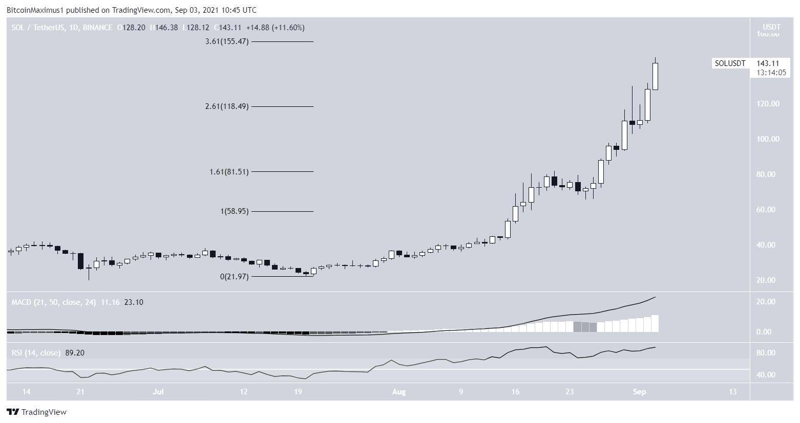 SOL has been increasing rapidly since July 20. On Aug 18, it was rejected by the 1.61 external Fib retracement level. It was then rejected by the 2.61 level on Aug 31.