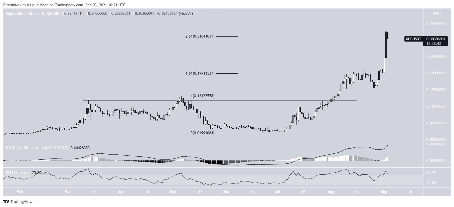 On Sept 2, XDB reached a new all-time high price of $0.35. The high was made very close to the 2.61 external Fib retracement level.