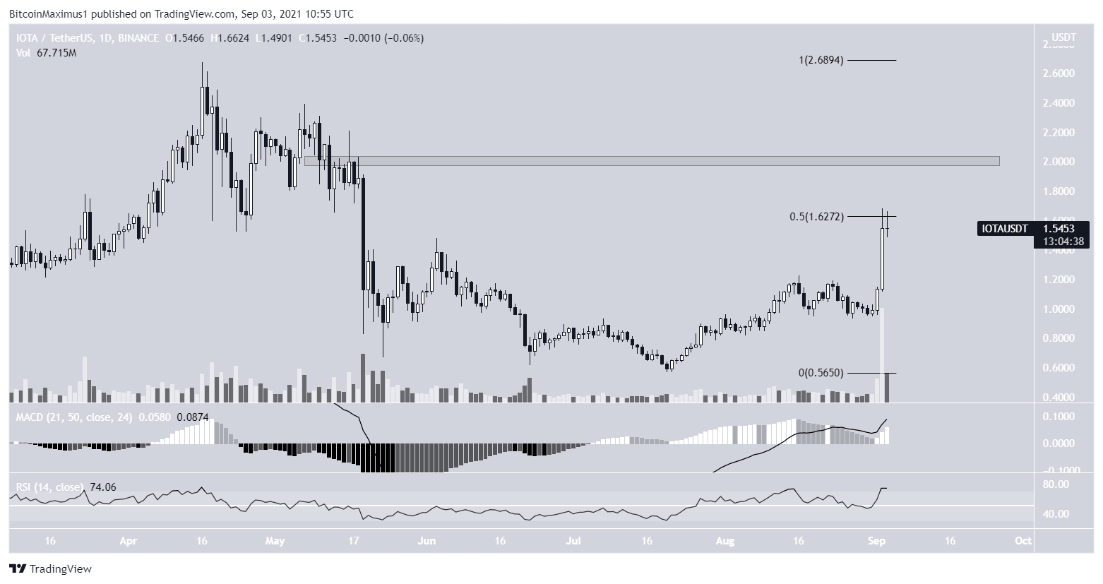 IOTA has been moving upwards since July 20. While upwards move accelerated on Sept 1, IOTA was rejected by the $1.63 resistance area the next day. This is the 0.5 Fib retracement resistance level.