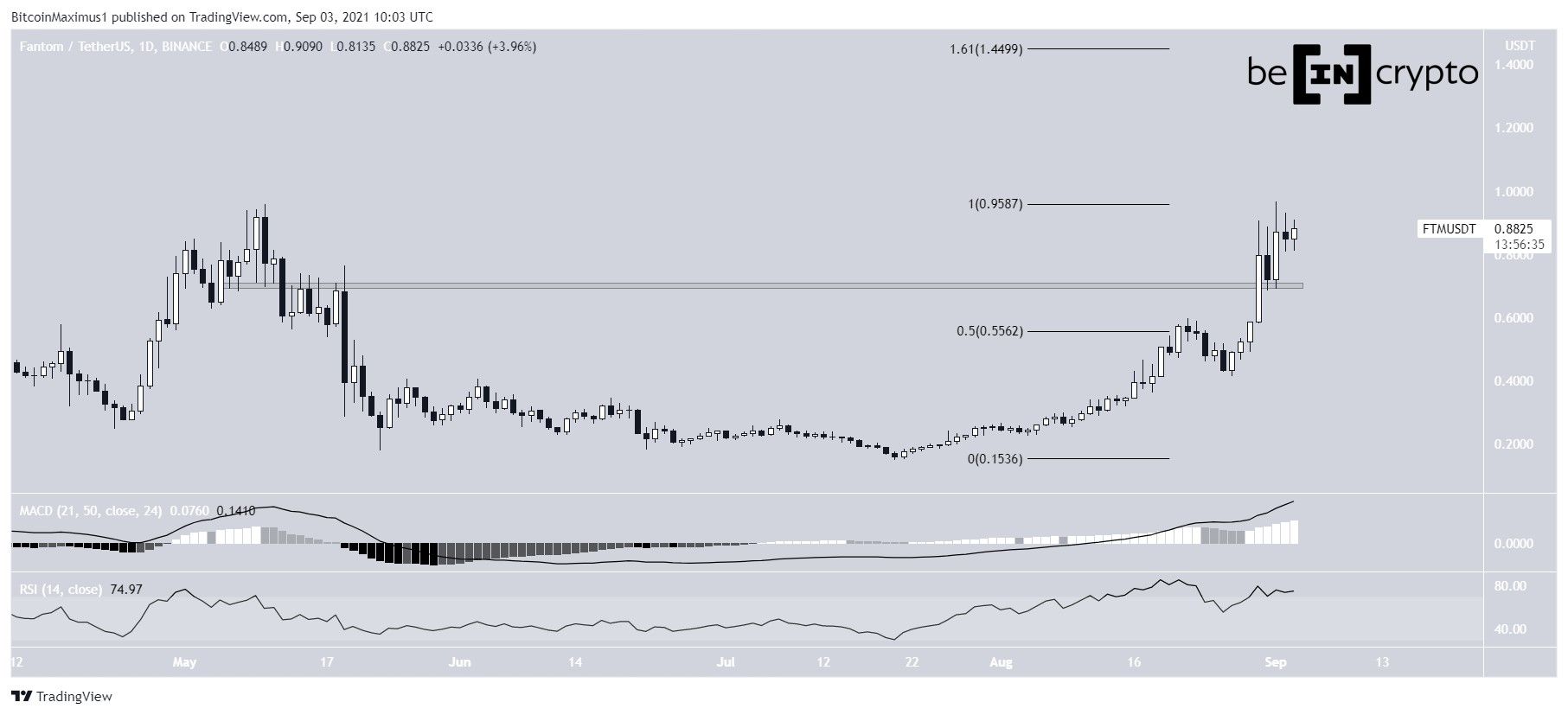 On Sept 1, it managed to reach a new all-time high price of $0.967. While it did fail to break out, the MACD and RSI are still bullish.