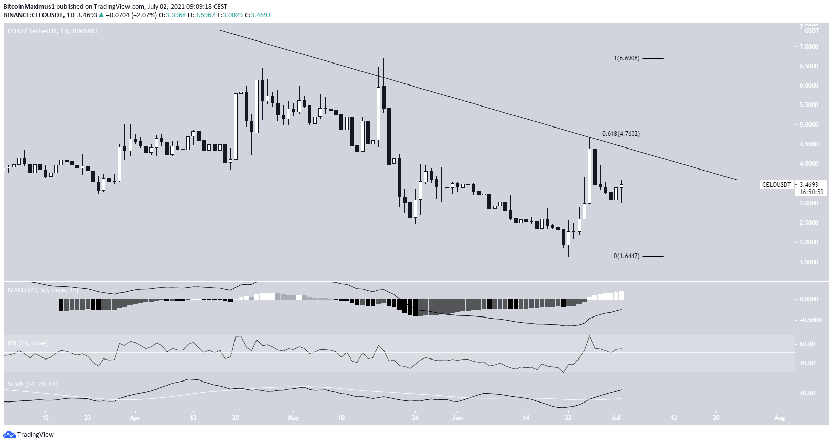 So far, it has reached a low of $1.65, on June 22. The upward movement that followed took CELO back to this descending resistance line on June 26.