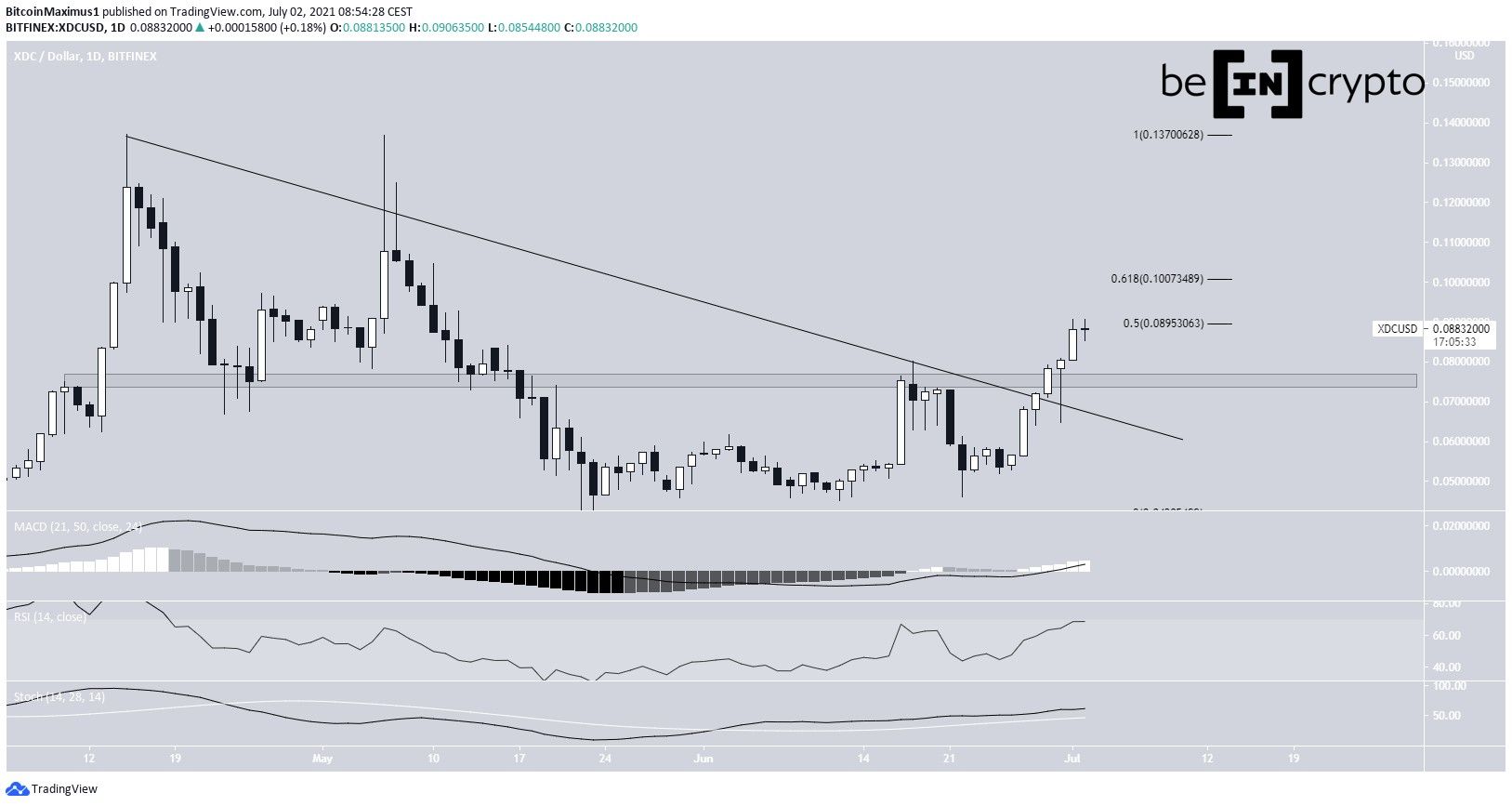 SponsoredAfter two unsuccessful breakout attempts, XDC was successful in moving above this line on June 29. In addition, it moved above the $0.075 horizontal support area.