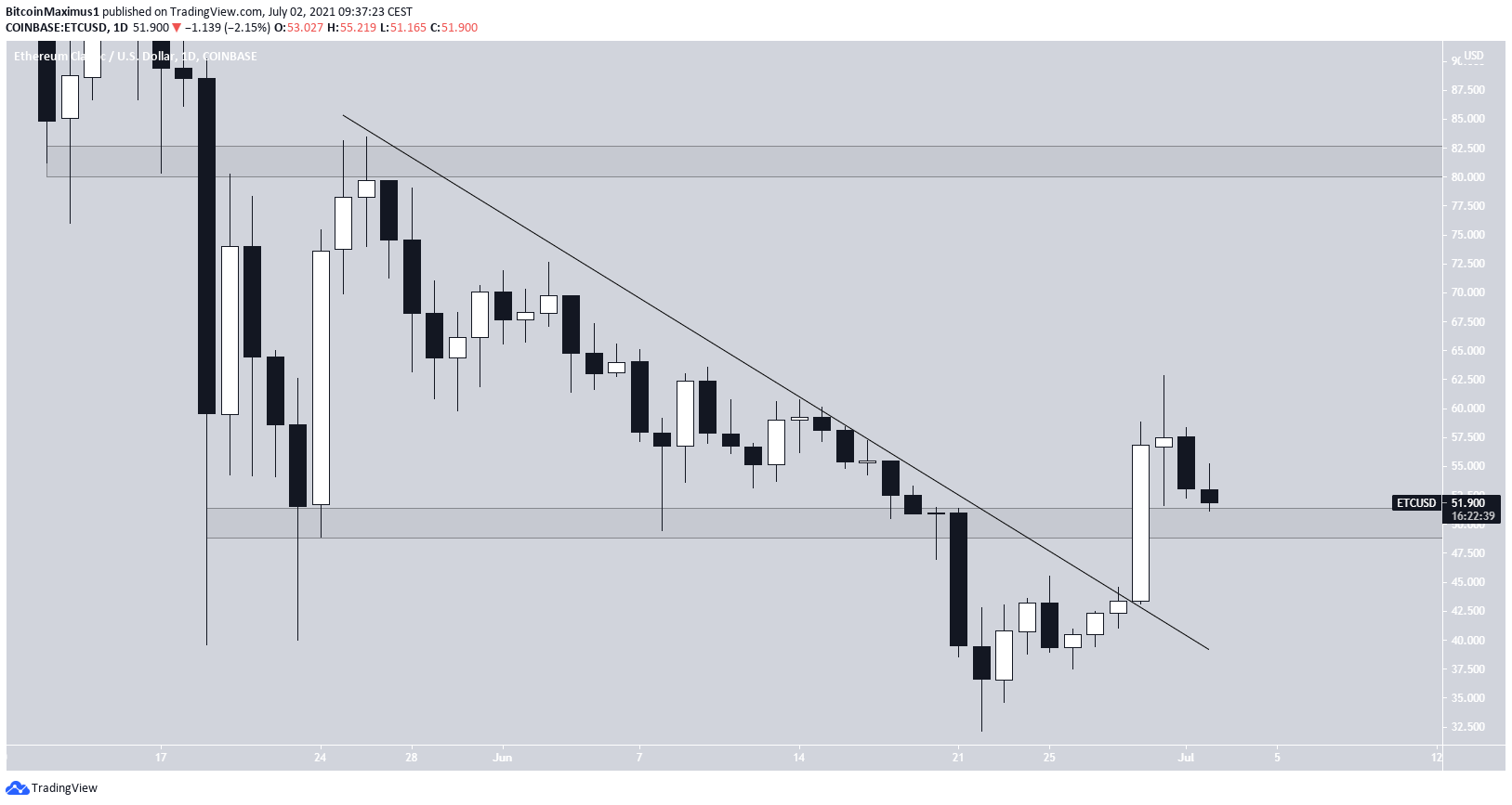 On June 22, ETC reached a low of $32.17 and has been increasing since. On June 29, it broke out from a descending resistance line and reclaimed the $50 horizontal area.