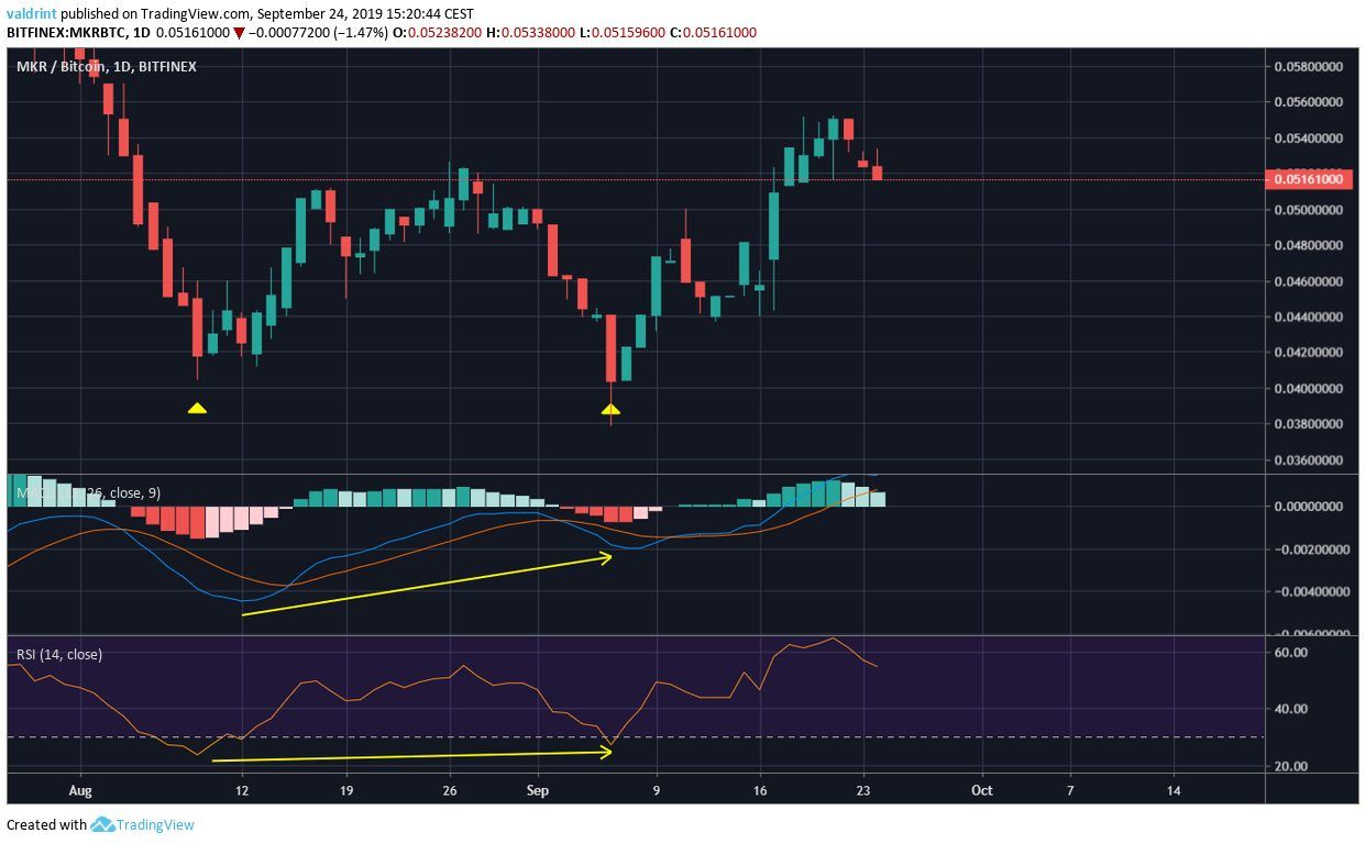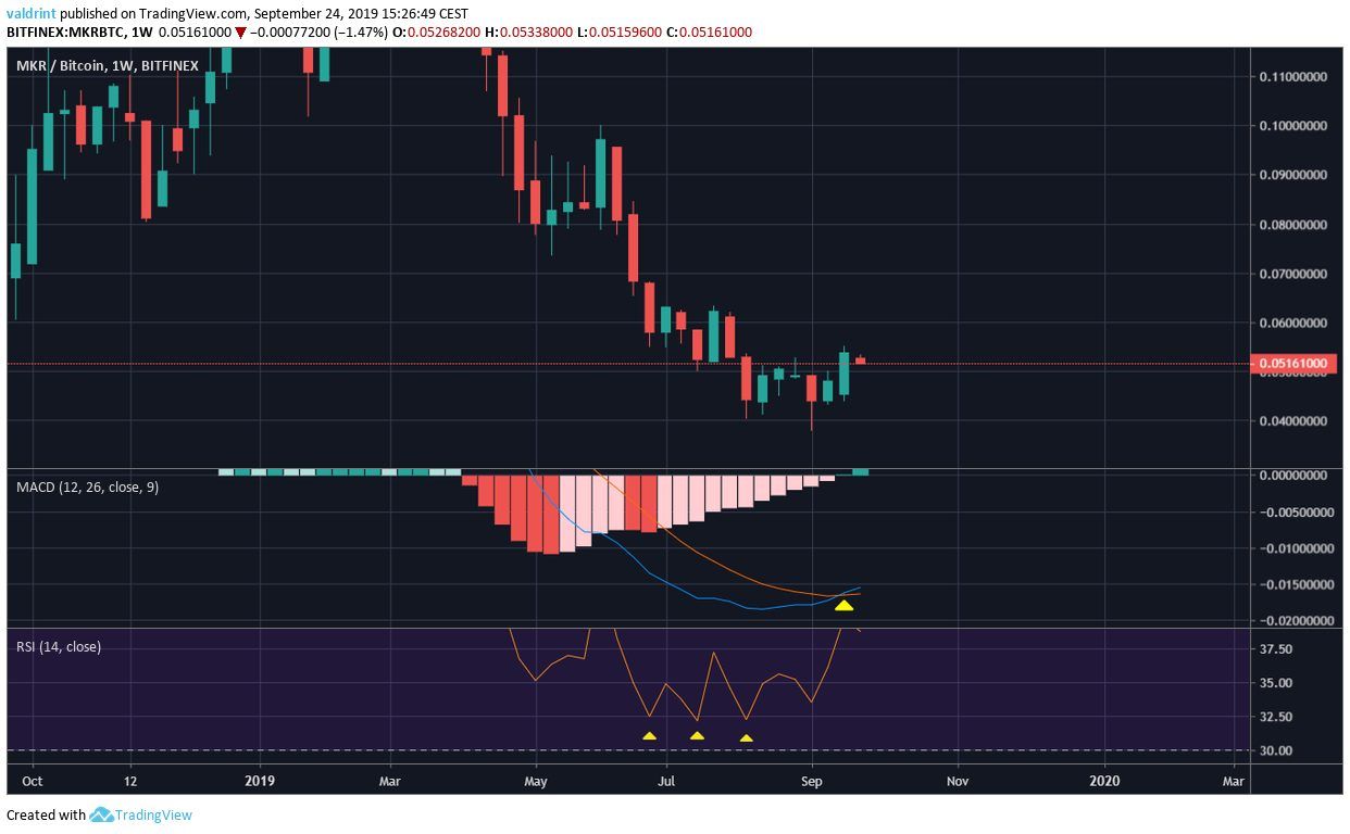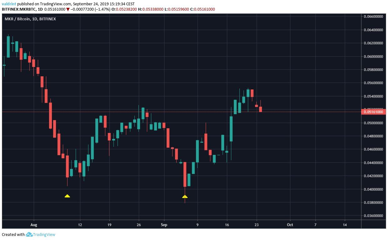 On August 9 and September 6, the MKR price reached similar price closes around ₿0.04.