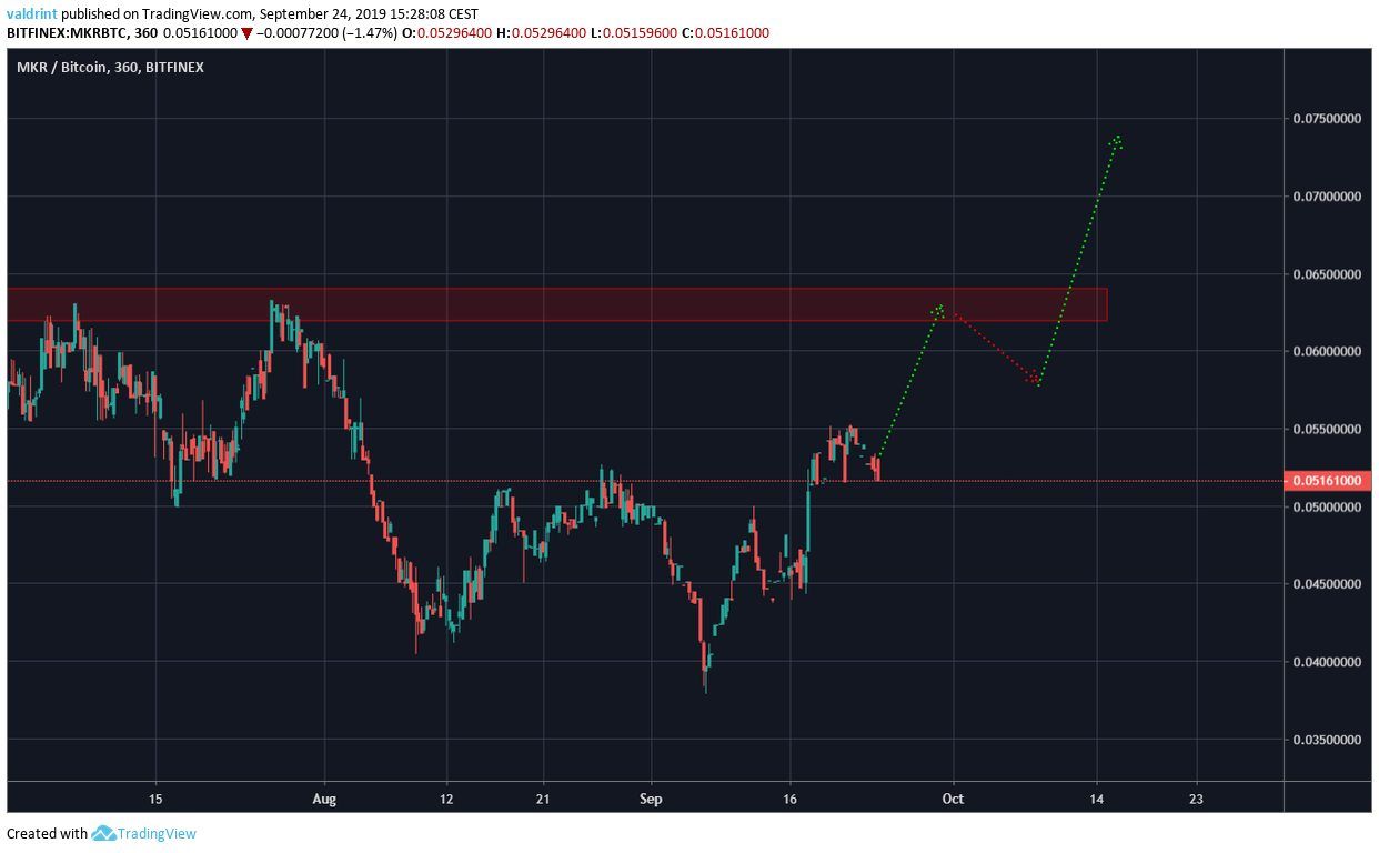 MKR is likely to increase and reach the resistance area at ₿0.063.