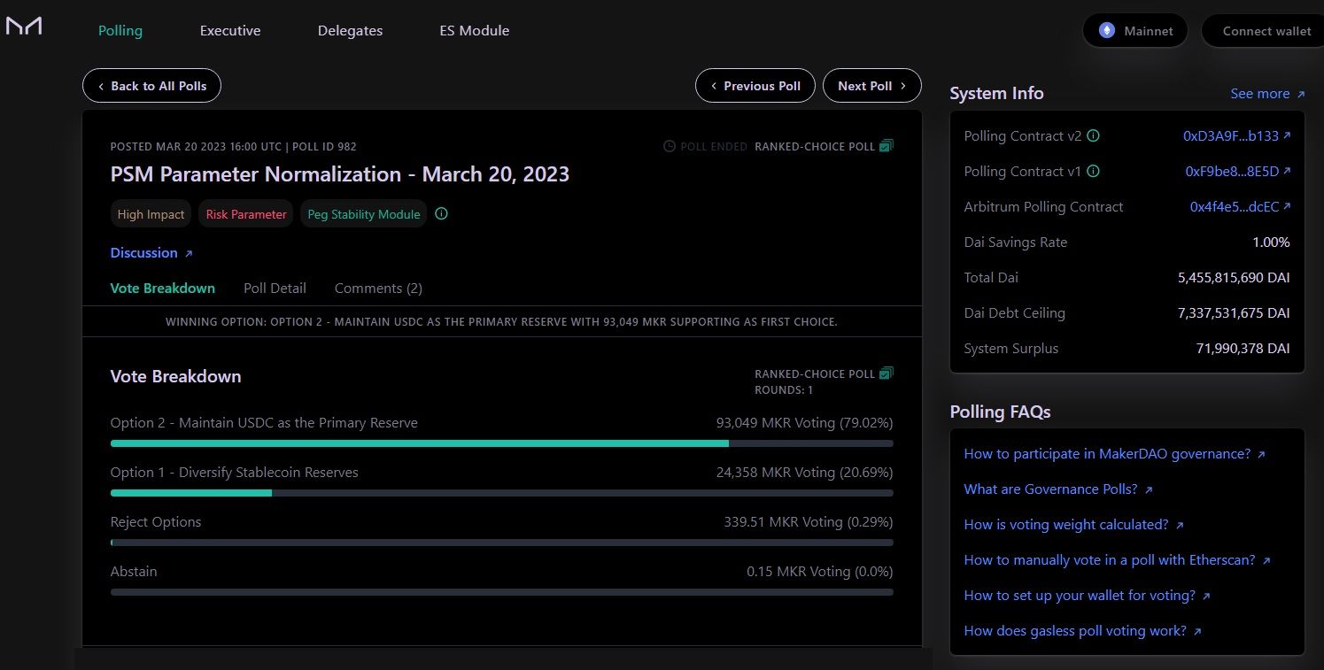 The MakerDAO community voted to retain the USDC stablecoin as a reserve for DAI. USDC became depegged during the downfall of Silicon Valley Bank but has since returned back to $1, appearing to have survived the crisis.