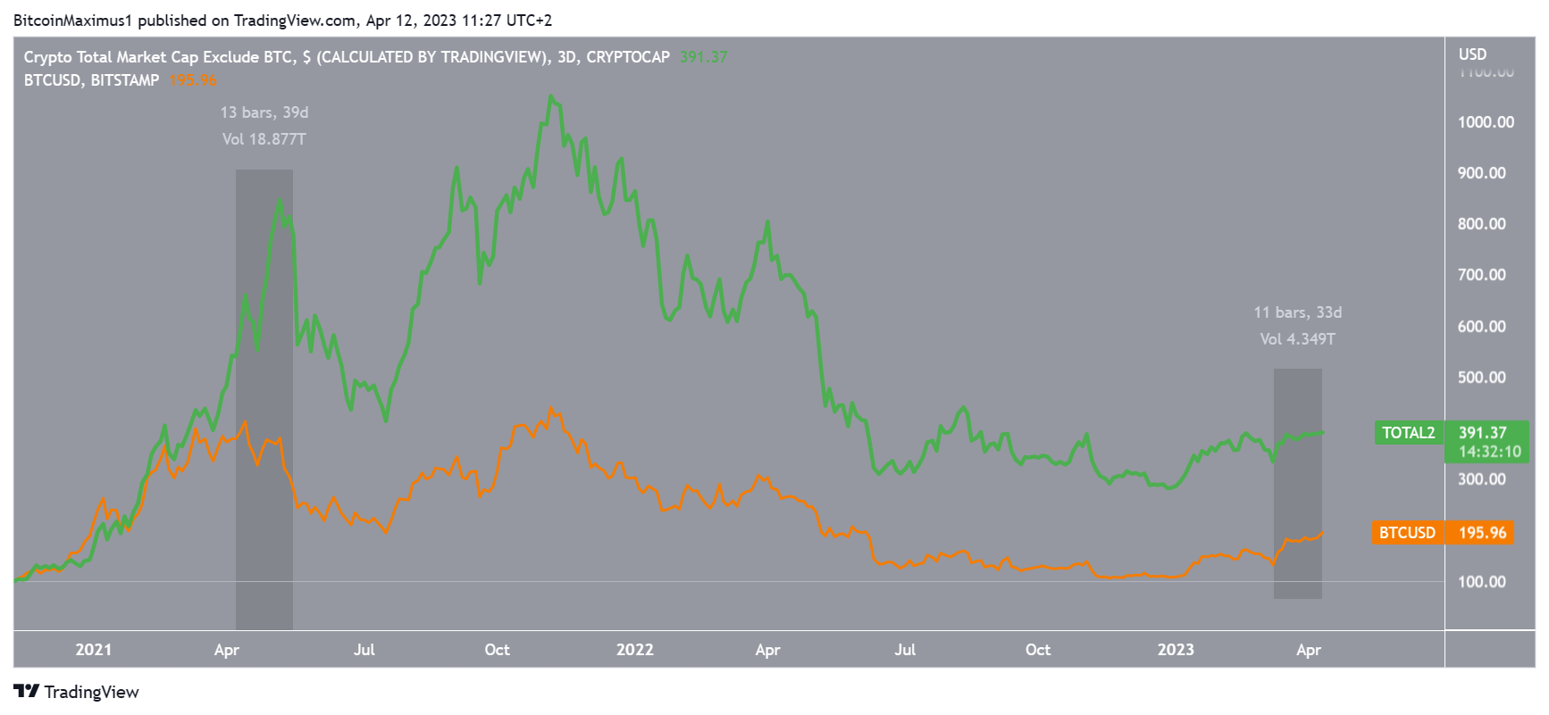 The relationship between BTC, BTCD and TOTAL2 is complicated and the price movement does not always adhere to the same rules.