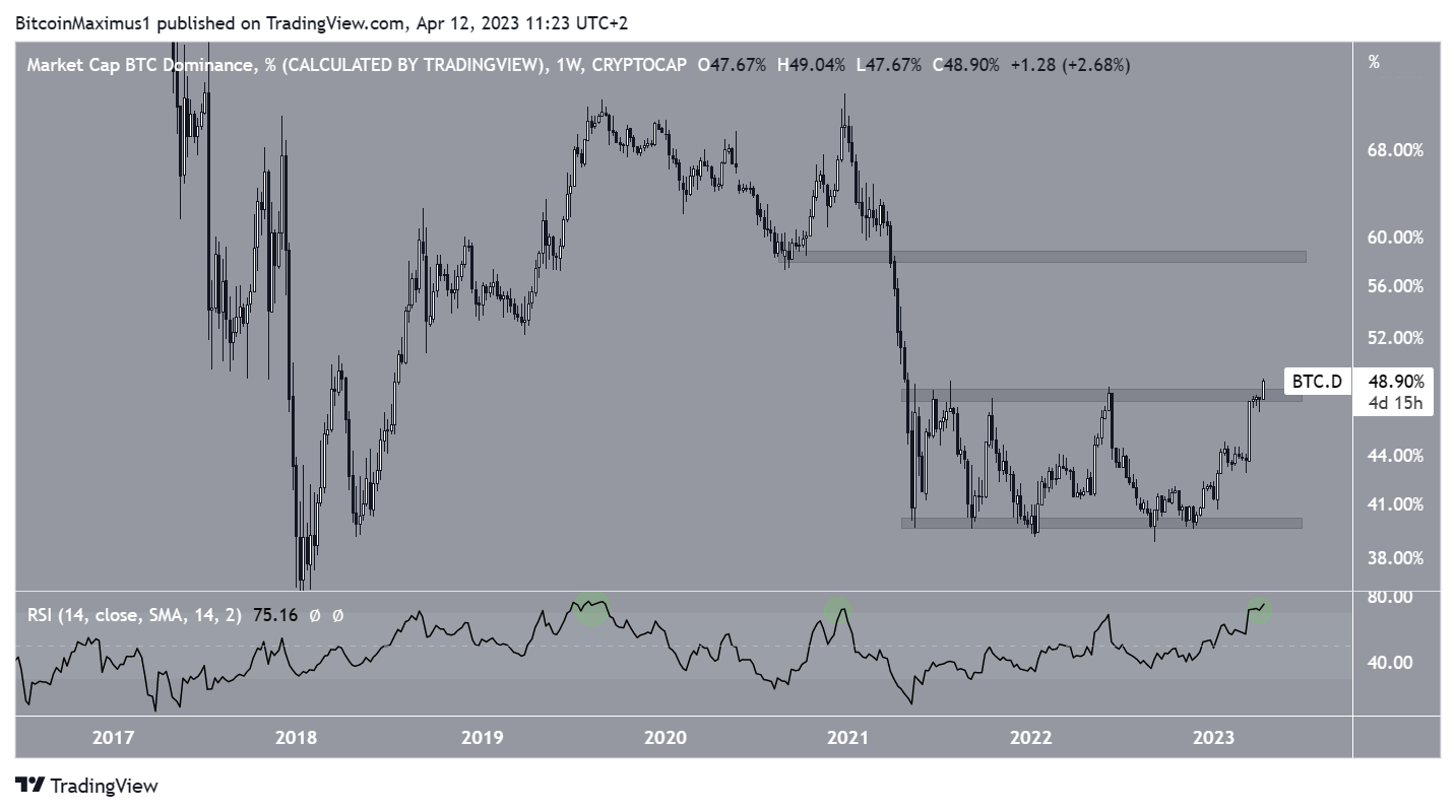 SponsoredBTCD is in the process of breaking out from the 48% resistance area, which has been in place since May 2021. If BTCD breaks out, it could trigger a sharp increase toward 58%.