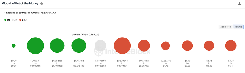 IntoTheBlock’s Global In/Out of Money data shows that MANA has a clear path to $0.70. As depicted below, MANA will likely break out of its current resistance at $0.62, the maximum price 10,000 addresses had paid for 177,000 tokens.