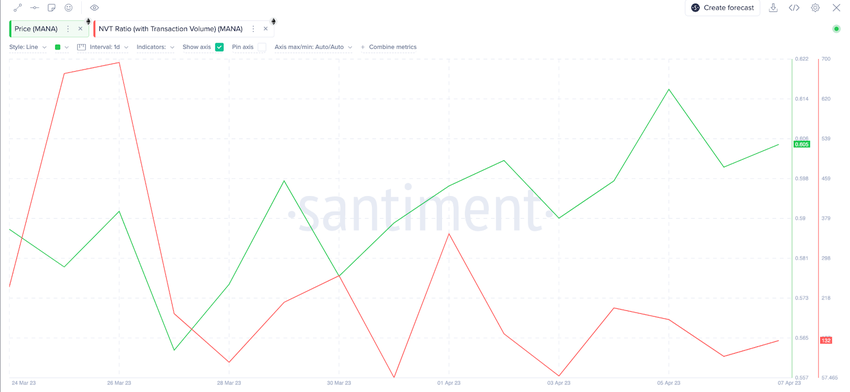 Furthermore, the decline in Network Value to Transaction Volume (NVT) ratio is another key indicator of a potential bull rally. The chart below shows MANA NVT ratio declined considerably from 693.64 to 132.66 between March 26 and April 7.