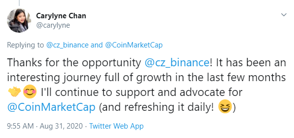 Chan is not the only one to be departing CMC. In addition to her, Spencer Yang is also leaving the company. According to his LinkedIn profile, Yang was vice president of operations at CoinMarketCap from June 2019 – August 2020, listing “acquired” next to his former title.