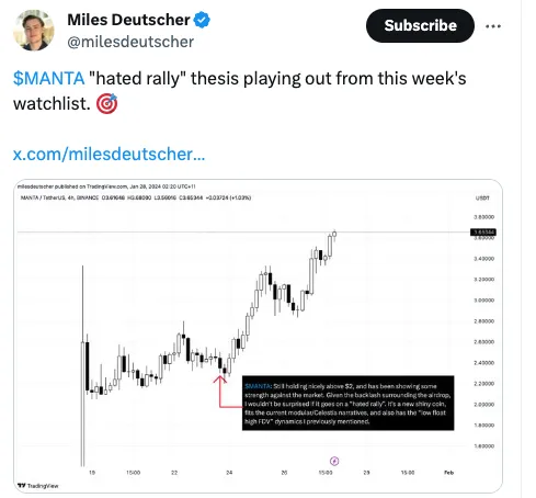 Crypto airdrop farmer and DeFi analyst Miles Deutscher said the MANTA token could undergo a “hated rally” fueled by disgruntled investors. The airdrop left a bitter taste in the mouths of recipients, who felt shortchanged by their low returns.