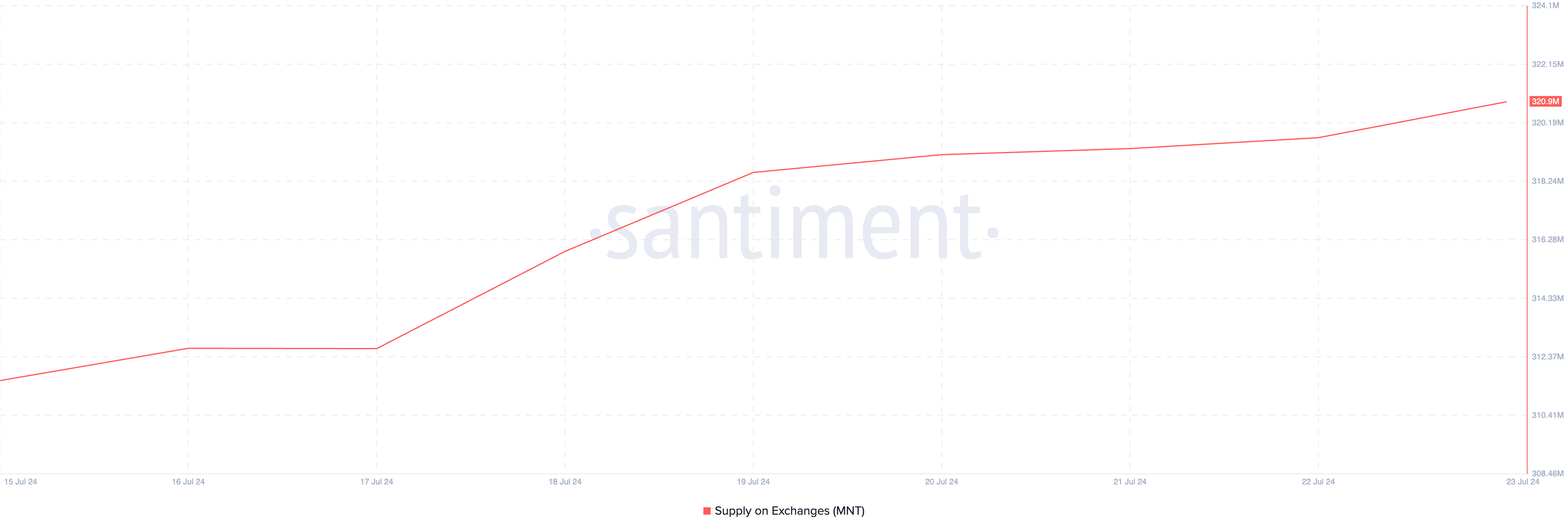 SponsoredAccording to Santiment’s data, 321 million MNT tokens worth around $286 million at current market prices are held in wallets on exchanges. The token’s supply on exchanges initiated an uptrend on July 17 and has since risen by 3%.