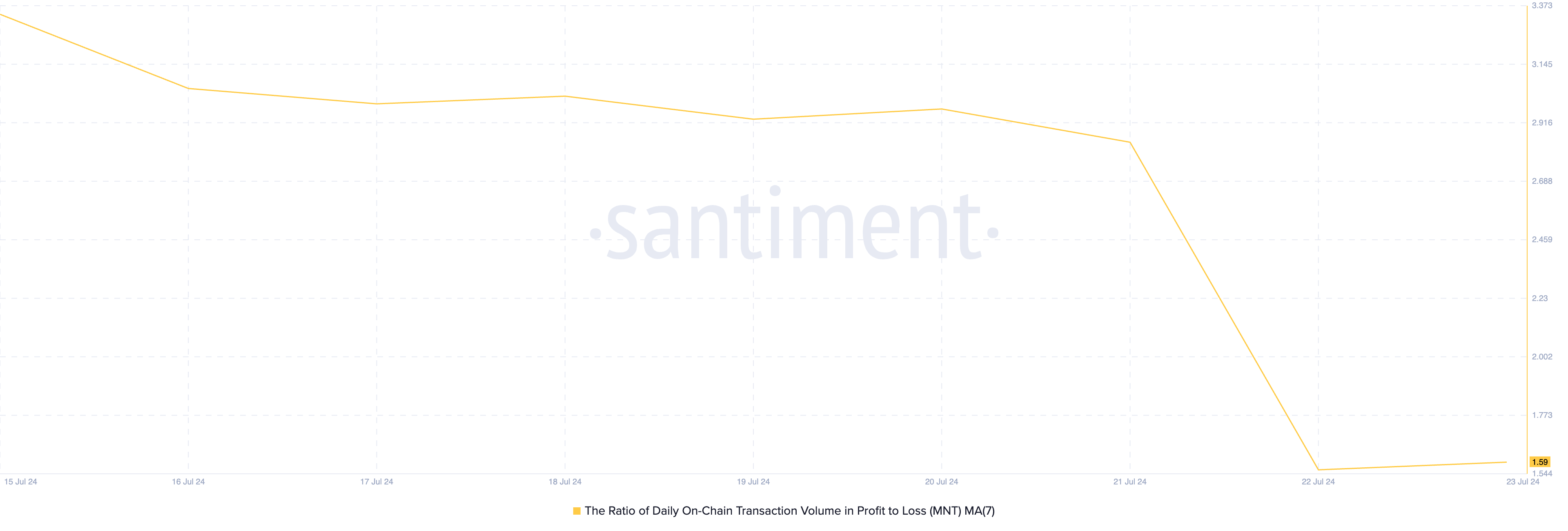 The seven-day moving average of its daily ratio of on-chain transaction volume in profit to loss indicates that, over the past week, for every MNT transaction resulting in a loss, 1.59 transactions have yielded a profit.