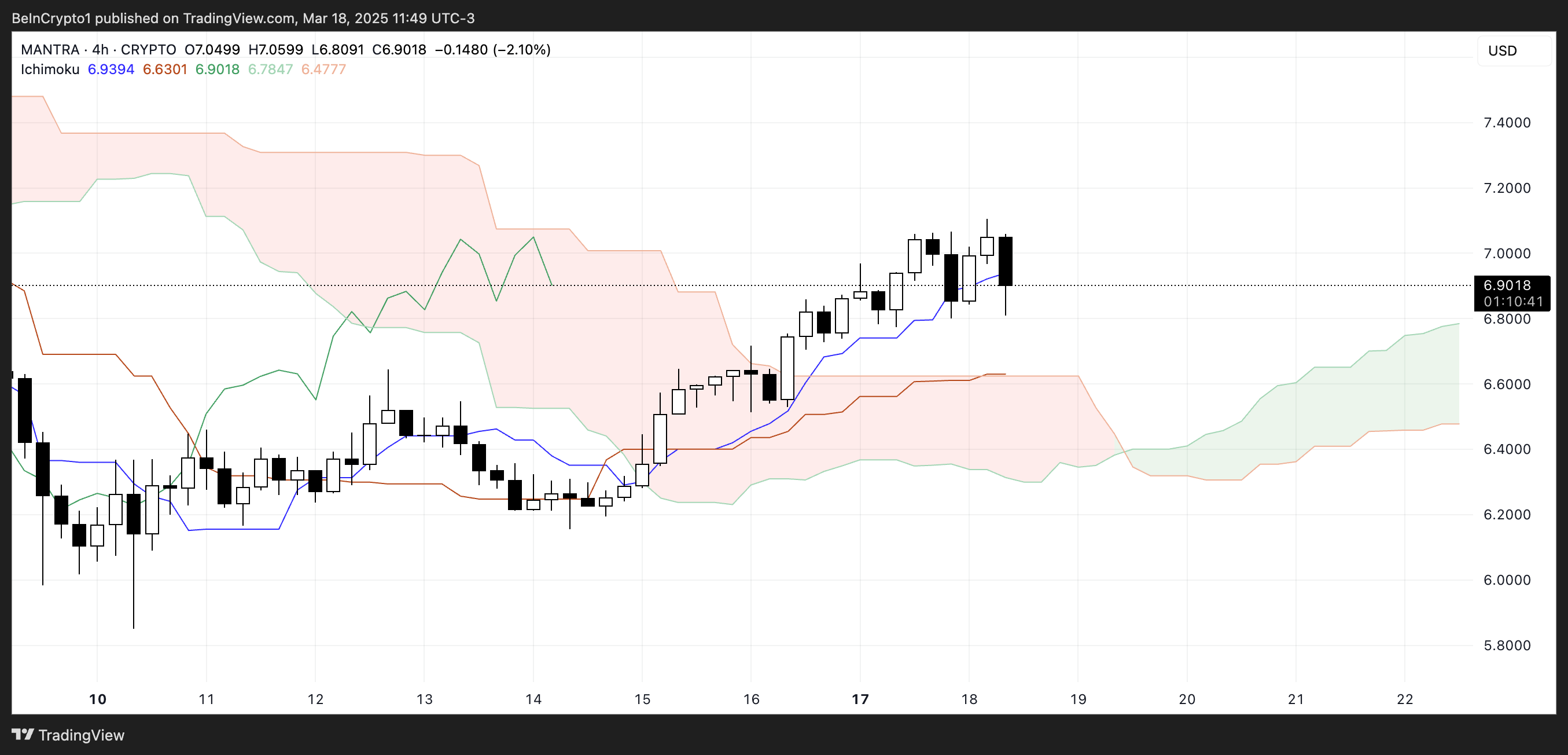 Mantra is currently showing a bullish structure on the Ichimoku Cloud chart.