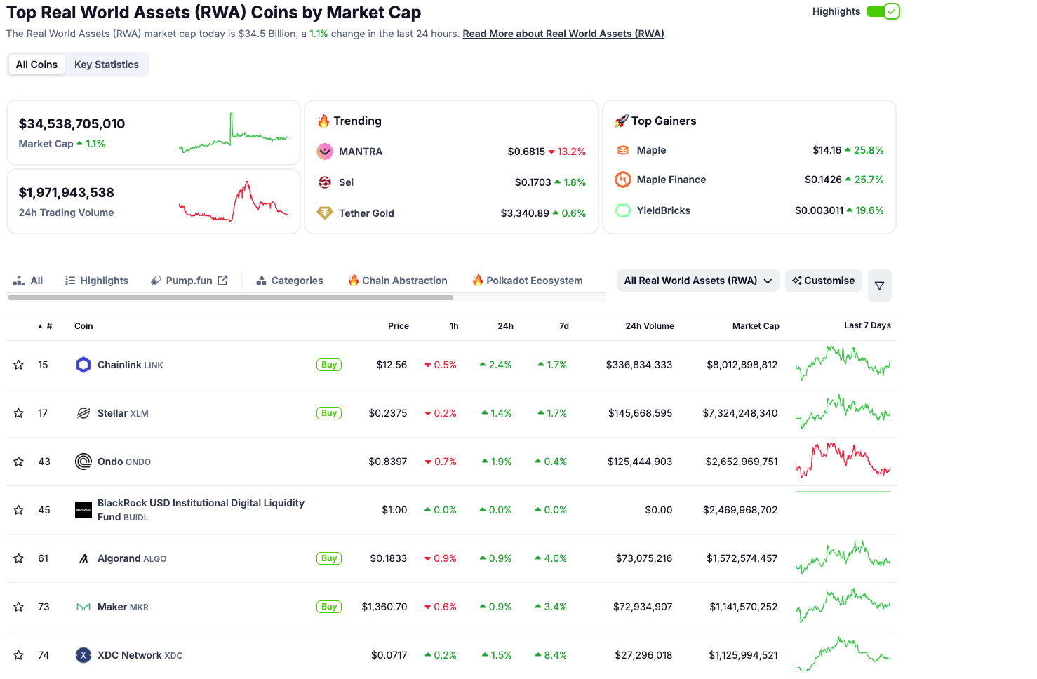 The sector’s overall momentum and potential are evident in its key metrics. CoinGecko reports that the total market capitalization of RWA coins currently exceeds $34.5 billion, with nearly $2 billion traded in the last 24 hours.