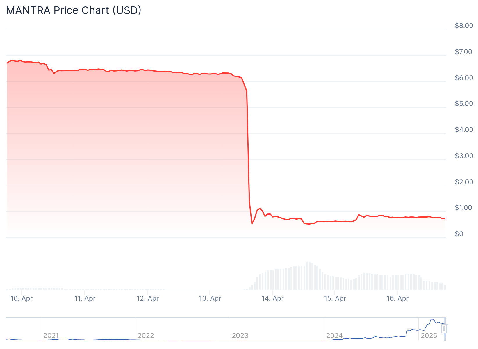 On Monday, the MANTRA (OM) token suffered a catastrophic price collapse, plummeting over 90% in under an hour and wiping out over $5.5 billion in market capitalization. The sudden crash took OM from a high of $6.33 to below $0.50.