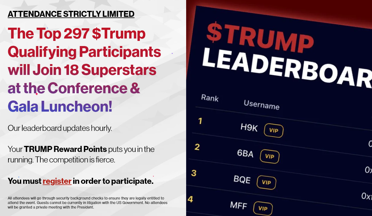 Attendance will be capped at 297 participants, selected through the project’s TRUMP token leaderboard.