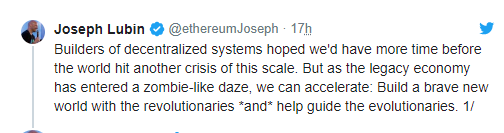 Lubin, who these days is at the helm of ConsenSys, explained how COVID-19 has put a fire under the feet of developers of decentralized protocols. He explained how before the latest economic crisis, he expected central bankers would “kick the can down the road” for some time. But the pandemic changed all that.