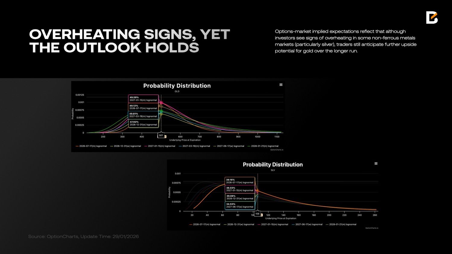 Structurally rising demand for critical minerals, combined with long-cycle supply constraints, makes commodities behave more like “supply-side assets” than mere mirrors of the traditional business cycle. Options-market implied expectations reflect this: although investors see signs of overheating in some non-ferrous metals markets (particularly silver), traders still anticipate further upside potential for gold over the longer run.