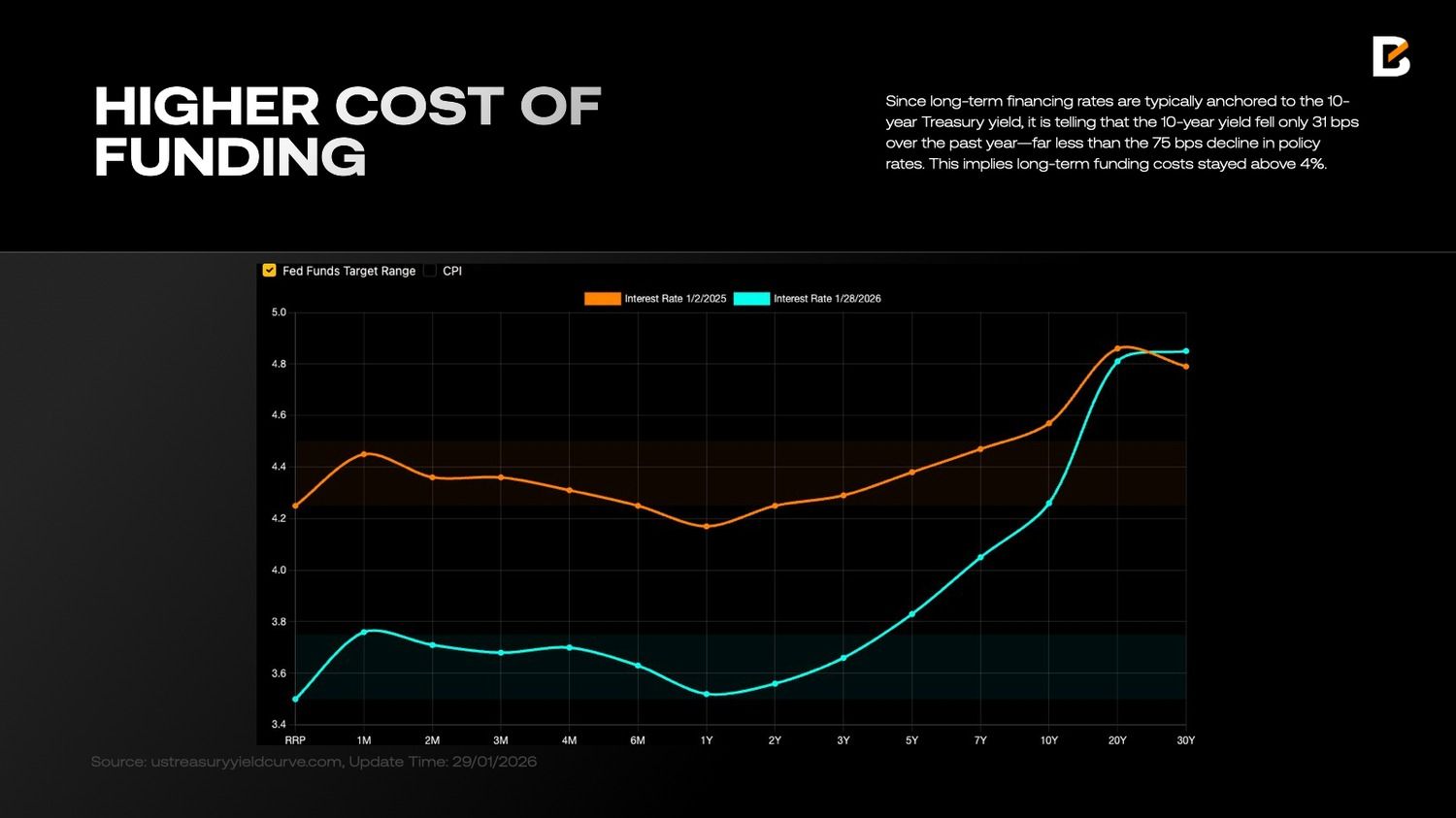 Since long-term financing rates are typically anchored to the 10-year Treasury yield, it is telling that the 10-year yield fell only 31 bps over the past year—far less than the 75 bps decline in policy rates. This implies long-term funding costs stayed above 4%.
