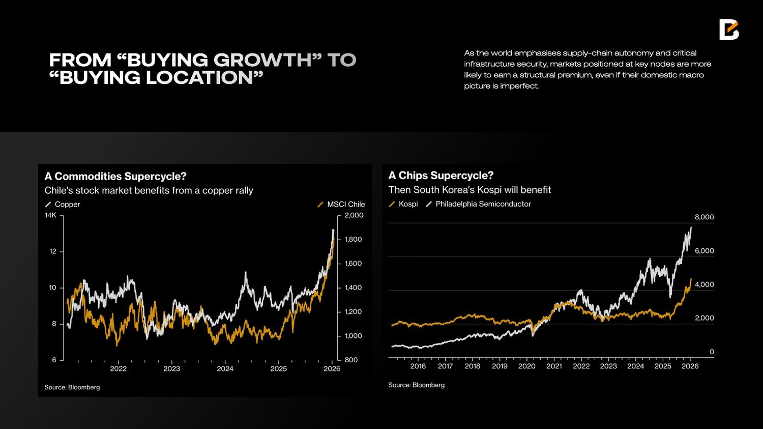 If 2010–2021 equity allocation was largely about “buying growth and falling discount rates”, 2026 is more about “buying location”. “Location” refers to where a market sits on three maps: the resource map, the compute map and the security map. As the world emphasises supply-chain autonomy and critical infrastructure security, markets positioned at key nodes are more likely to earn a structural premium, even if their domestic macro picture is imperfect.