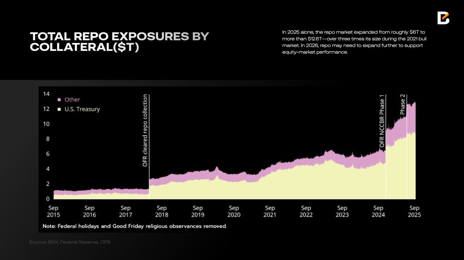As a result, in 2025 alone, the repo market expanded from roughly $6T to more than $12.6T—over three times its size during the 2021 bull market. In 2026, repo may need to expand further to support equity-market performance.